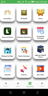 Horaires des prière en fonction de la region Horaires de Rupture pendant le Ramadan Le Coran Des notification sur les nouveautés Rapels pouvant etre partager 40 hadith Nawawi. Calendrier islamique Des annonces Centres islamiques Receuil des invocations et Duas Video islamique Audio de preches Les agences de Hajj Les évènements et annonces islamique